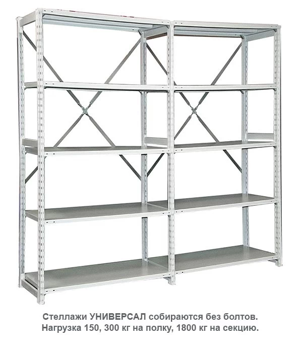 Стеллаж ТСУ монтируется без болтов, с помощью особых стяжек и крестовин жёсткости, что позволяет с лёгкостью собрать его без специальных инструментов. Уникальная конструкция придаёт изделию повышенную прочность и устойчивость.
